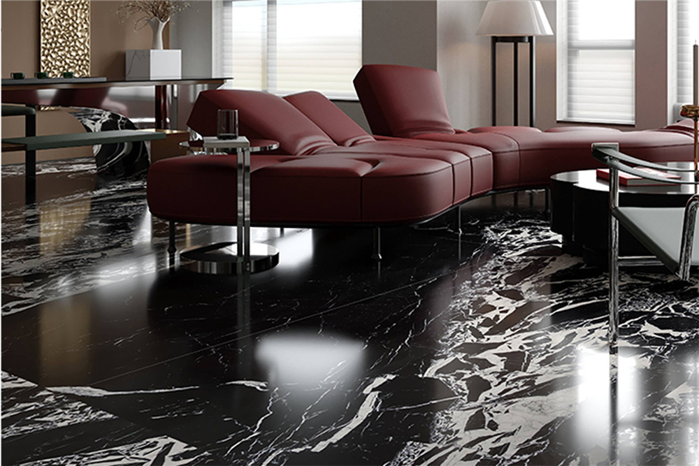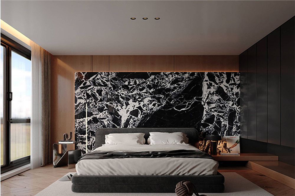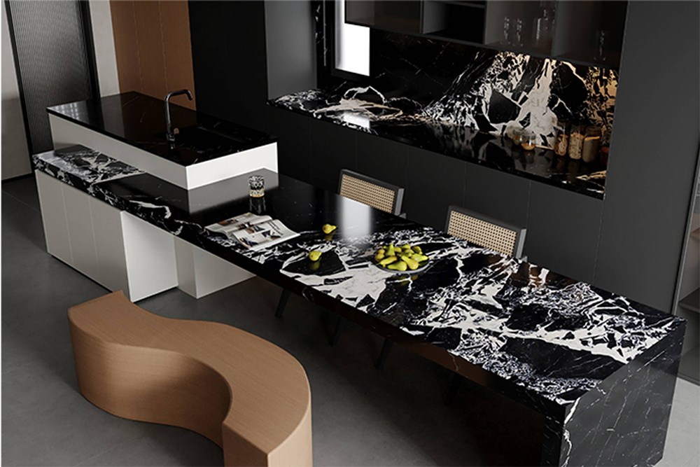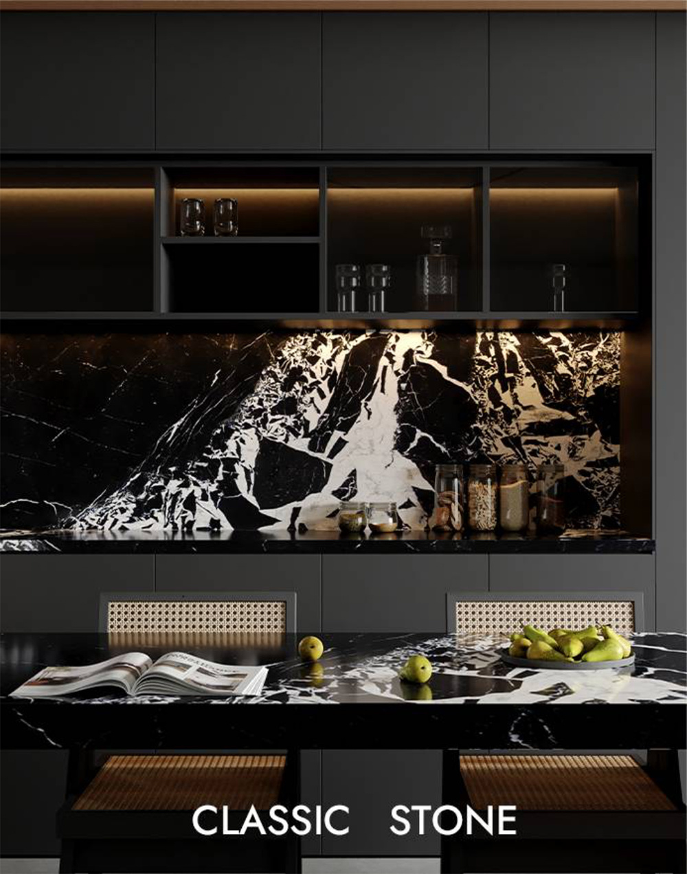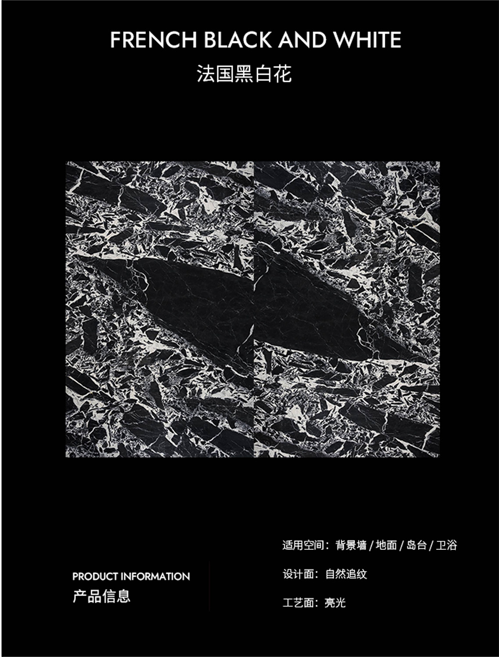 如淬炼千年的黑曜石熔入鎏金星河,法国黑白花以近乎压迫性的深邃底色,宣告空间的绝对统治力。比普通黑大理石多三分历史重量感,比岩板多七分天然戏剧性,这是专为征服者准备的空间战袍。