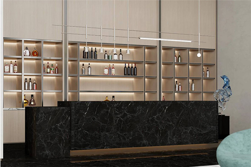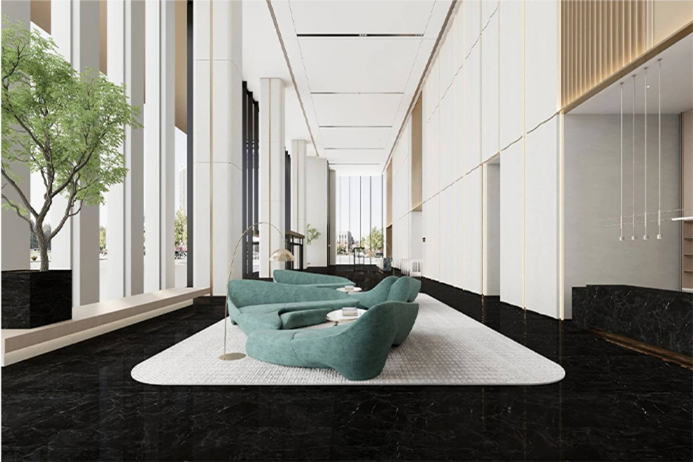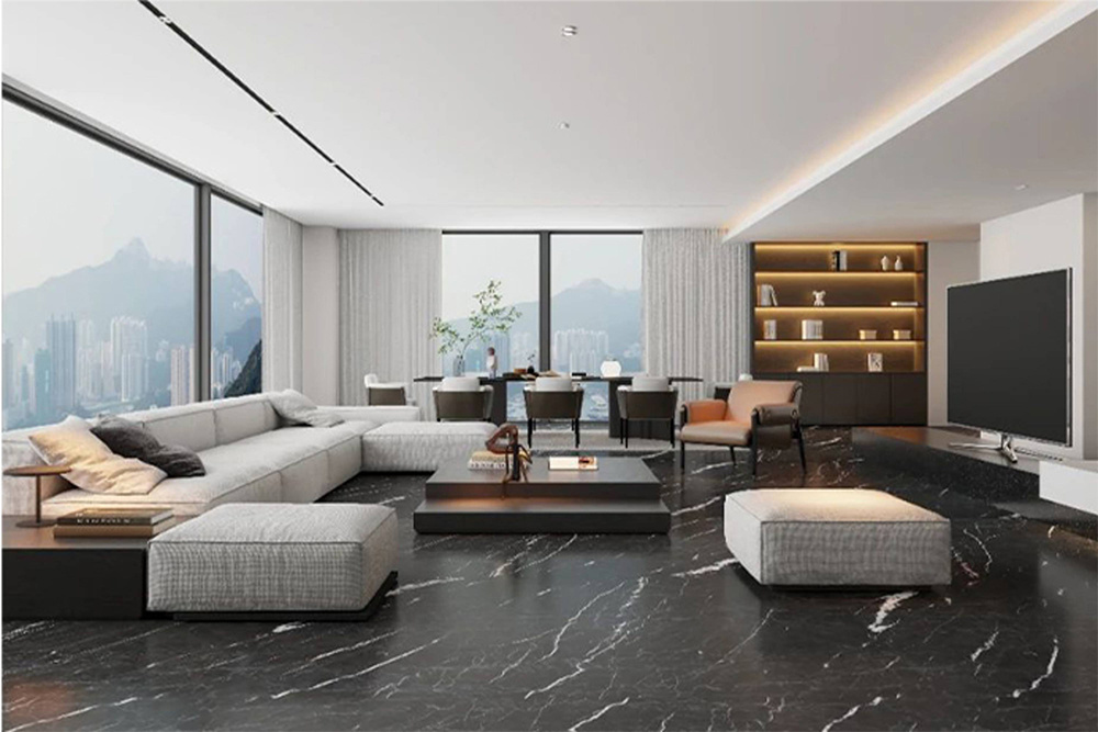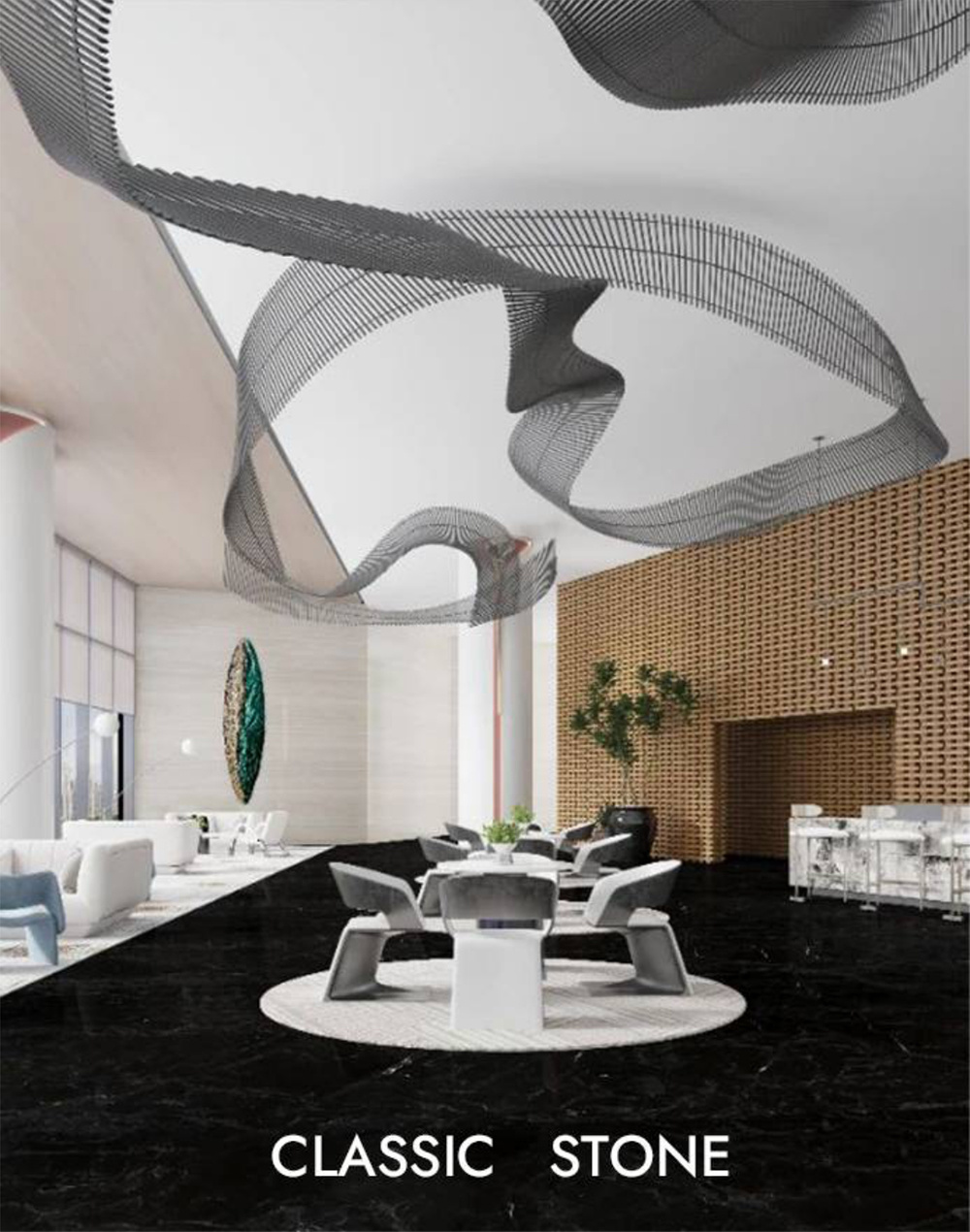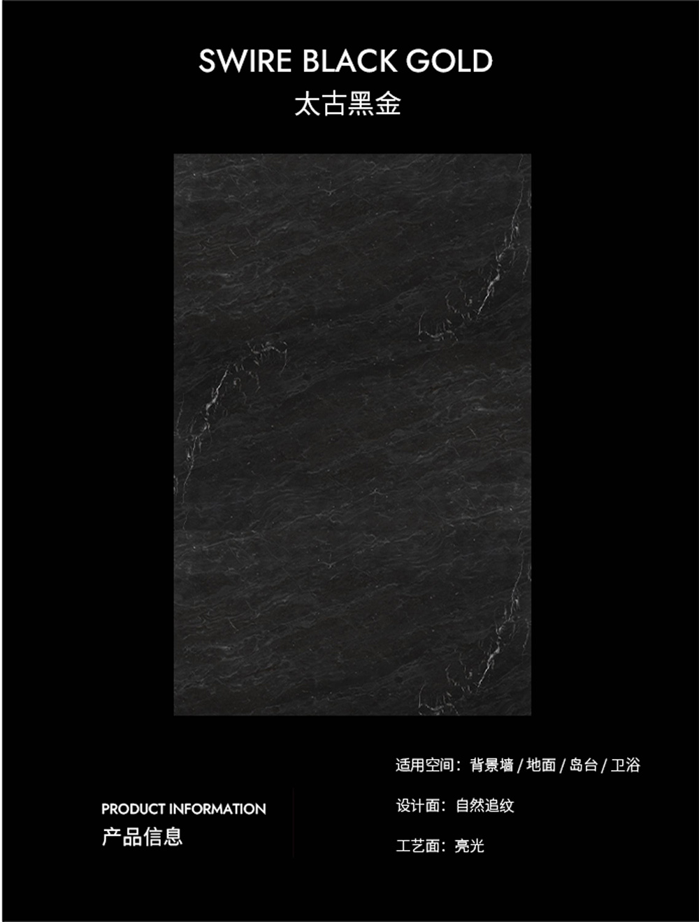 纯黑基底,神秘高贵,蕴含着时光的沉淀、历史的厚重感和原始的自然力量。用于大面积铺贴,给人一种沉稳、经典且永恒的感觉。
